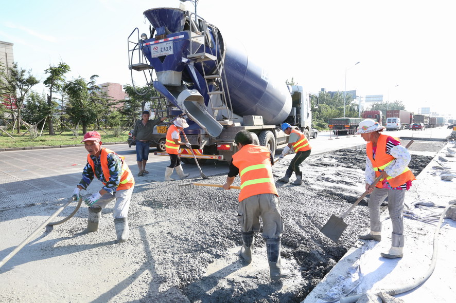 在大港路“新光路至零公里”路段,筆者在水泥路上看到一塊塊被切割成方方正正的凹面,四周都架好防護欄等安全防護設施,在華東城北門偏東不遠處,一臺挖掘機的鏟斗被換上沖擊破碎錘,正在一大塊破損的水泥路面沖擊破碎作業(yè),“嗒嗒嗒”的沖擊聲十分震耳。在與現(xiàn)場作業(yè)的盛達市政公司市政維修項目部副主任史如勤交流中得知,該路段是附近集團箱基站進出港口集裝箱車輛的重要通道,每天有好幾百輛集裝箱車輛進出,水泥路面不堪重負,損壞比較嚴重,根據(jù)開發(fā)區(qū)創(chuàng)衛(wèi)工作要求,由他們對該路段破損處進行局面分割維修,整個路段維修面積達到5000多平方,為保證道路使用通行,采取半幅維修、邊破碎邊澆灌的方式,保證施工進度,現(xiàn)正在維修北側(cè)路面,整個路面維修計劃在8月底完成。“因為創(chuàng)衛(wèi),我們下一步還要對轄區(qū)內(nèi)的破損、歪到的路牙石進行維修扶正,242路段瀝青破損路面維護,還要開通四處道口,而現(xiàn)在事多人少,人手比較緊張,我們周六周日都沒有休息,就是想把創(chuàng)衛(wèi)工作任務一項一項地及時完成,決不能拖創(chuàng)衛(wèi)工作后腿?!彼呎f邊用肩上的毛巾擦著額頭上的汗水。